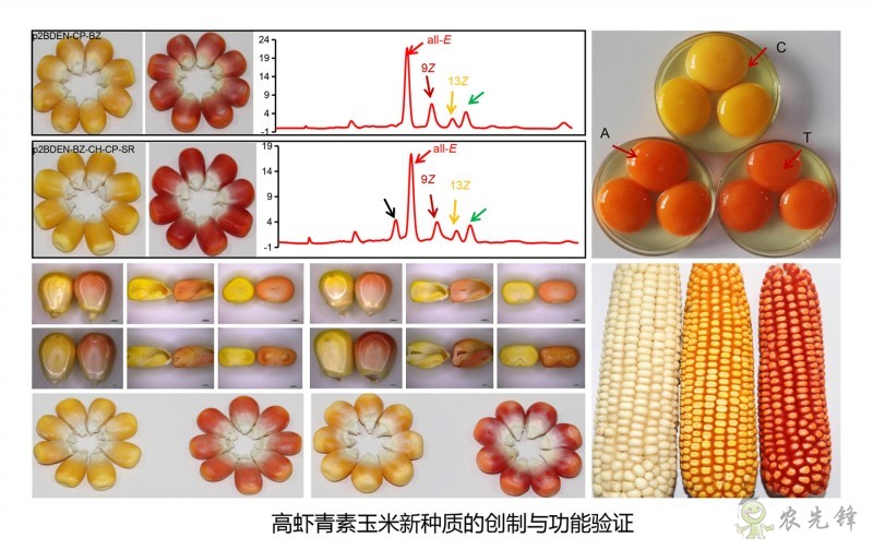 據介紹,蝦青素屬于類胡蘿卜素的一種,通常存在于藻類、蝦、蟹等海洋生物中,由于具有較強的抗氧化性和保健功效,在生活中有廣泛應用。該研究采用合成生物學的“源-庫-流”策略設計了蝦青素代謝途徑,通過增加番茄紅素的合成,并使用RNAi技術引導番茄紅素向β-胡蘿卜素的轉化,使用種子特異性雙向啟動子驅動β-胡蘿卜素羥化酶基因和β-胡蘿卜素酮化酶基因在玉米籽粒里將類胡蘿卜素合成途徑延伸至蝦青素合成,創制的高蝦青素玉米種質含量達到47.76-111.82毫克/千克干重,是已有蝦青素基因工程谷物中報道的6倍。且飼喂蛋雞后,所產雞蛋蛋黃中可積累12.10-14.15 毫克/千克的蝦青素,每枚雞蛋蝦青素含量約為540微克,可滿足人體日常抗氧化保健需求。